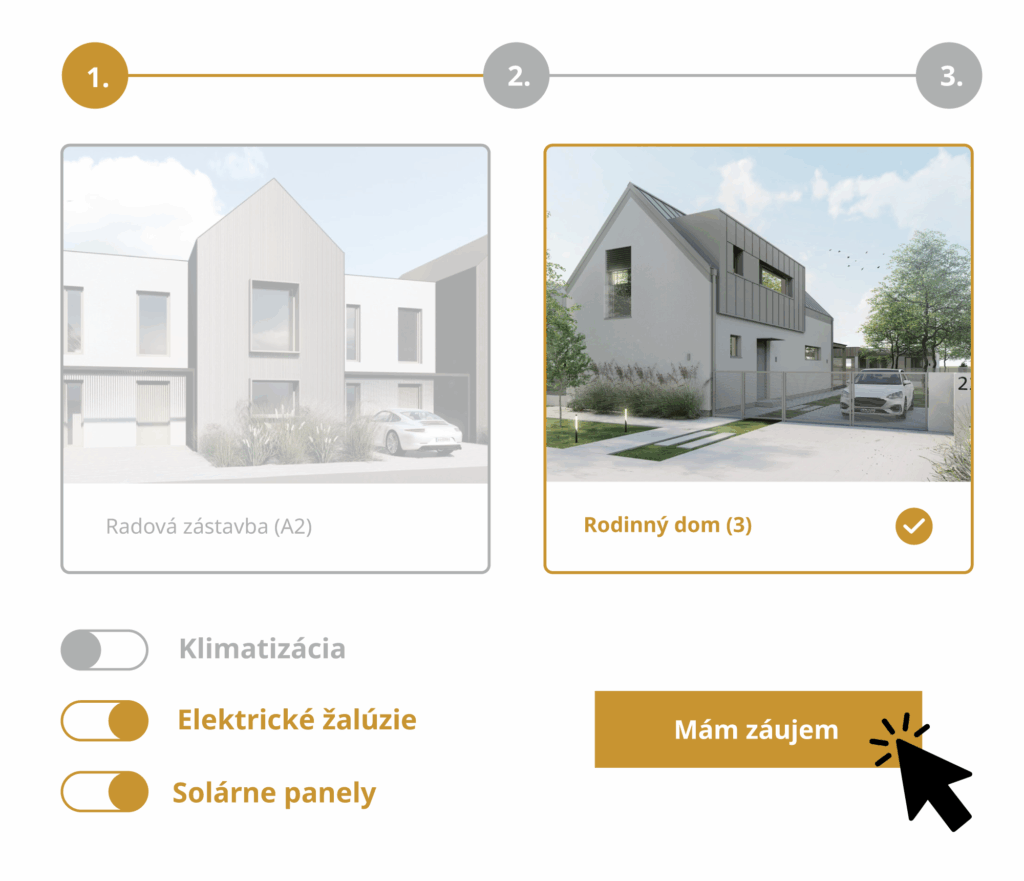 V našom konfigurátore si jednoducho vyskladáte základné parametre vášho budúceho domu – od typu domu až po voliteľné prvky, ako je klimatizácia, alarm, kúpeľňa, exteriérové úpravy či solárne panely.